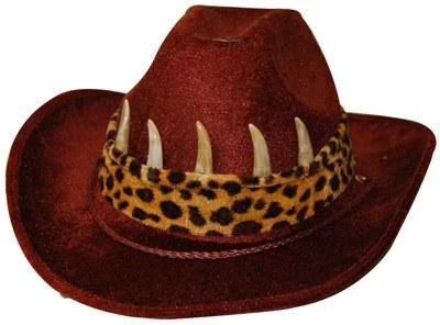 Brown cowboy style hat with leopard band and crocodile teeth
