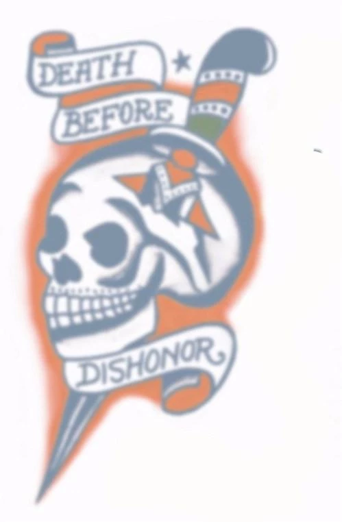 Temporary vintage 1950’S DEATH BEFORE DISHONOUR skull transfer stick-on tattoo. Looks real.