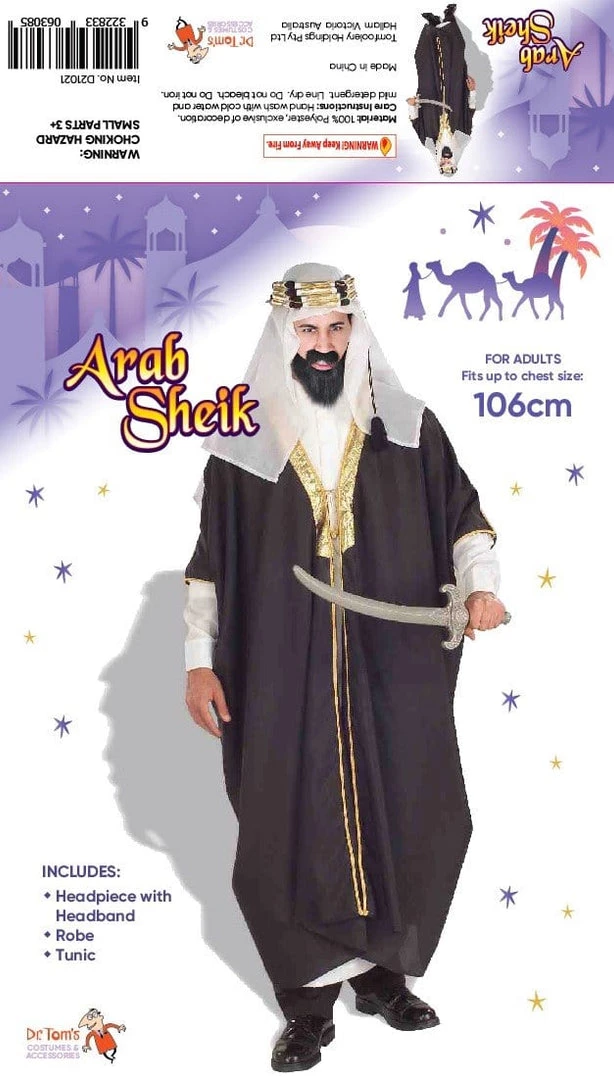 Ride the caravans of the desert to exotic ancient lands in this Arab Sheik Fancy Dress Costume which includes long white tunic with black and gold robe and headpiece with matching headband. Complete your look with faux beard.