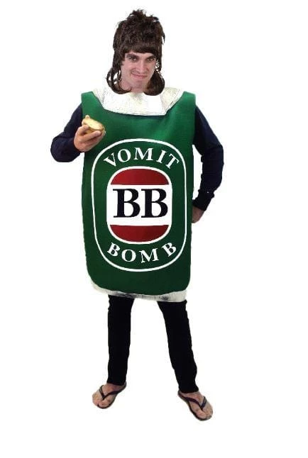 Oath mate, get some of this Bogan Beer into ya. You’ll be right, mate. Beer Can Costume is foam backed soft green tunic with BB Vomit Bomb logo printed on front.Â