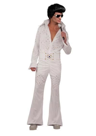 Viva Las Vegas! Dress like the King in this Vegas Rock Star costume. White 70s style jumpsuit with rhinestones and matching belt. Elvis style glasses and wig sold separately. Perfect for 50s, 70s, Rock n Roll, Karaoke, Weddings, Buck’s Nights.