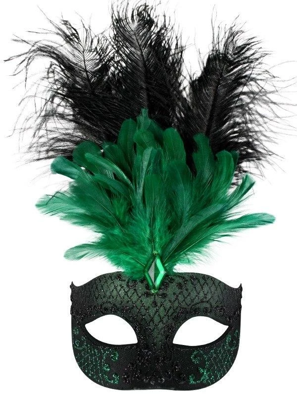 This stunning emerald and black eye mask ties on with black ribbon and boasts intricate glitter details and gloriously tall green and black feathers. This design also available in Purple and Red.