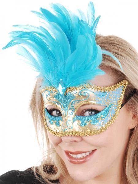 Beautiful venetian style mask in aqua and gold with gold glitter details and central aqua feather feature. Ties up with ribbon.