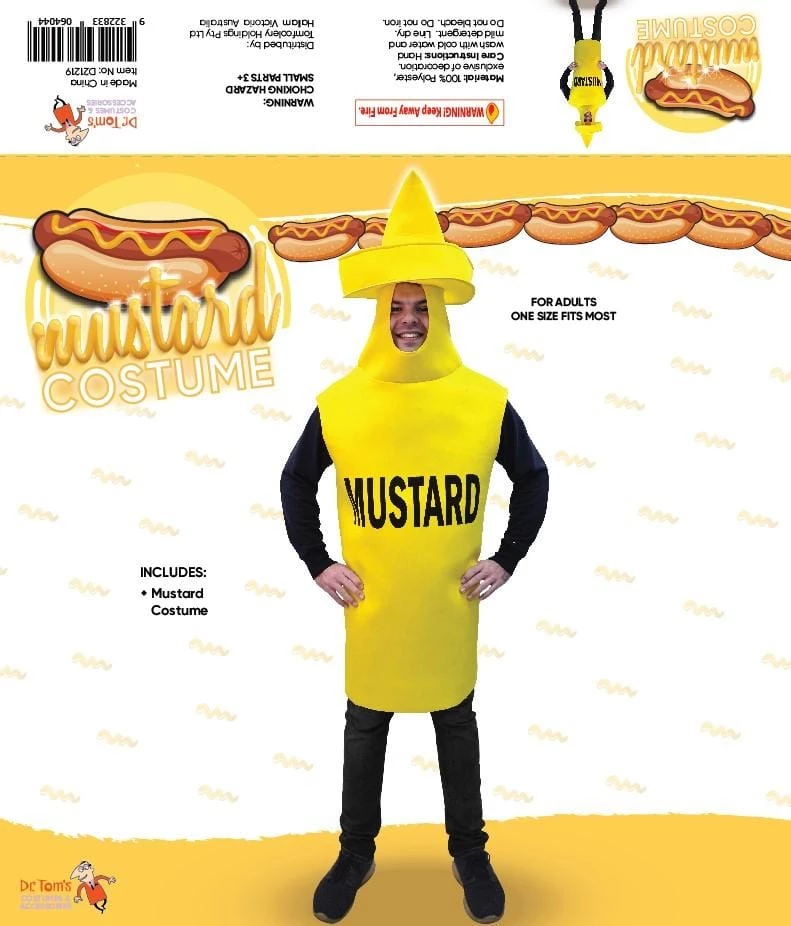 Novelty Mustard Costume for Adults. Matches with our Tomato Sauce Bottle Costume or with our Hot Dog Costume.