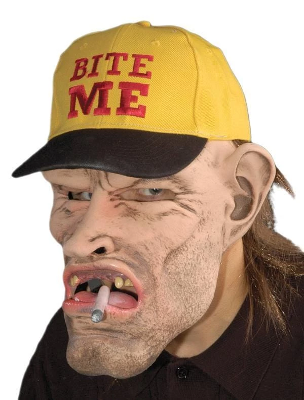 Male character mask includes an attached easy to wear adjustable “Bite Me” hat with mullet.