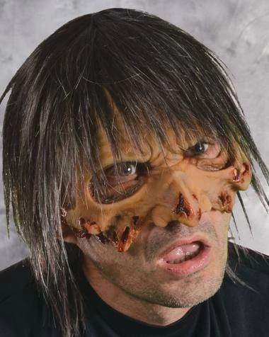 An excellent solution for transforming into a zombie, provides un-inhibited talking, singing, acting or drinking. Great for zombie walks or haunts. The head piece natural blends into the face along the cheek line and nose. The integral wig holds the head piece on, no glue necessary. Great with a little make up for a professional look, a few drops of stage blood or with no make- up at all.